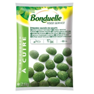 Spinach chopped into ready-to-cook pebbles : already trimmed, cut, and blanched. EAN : 3083680009591 Packaging type : Bag 2,5 kg Attributes :Multilingual...